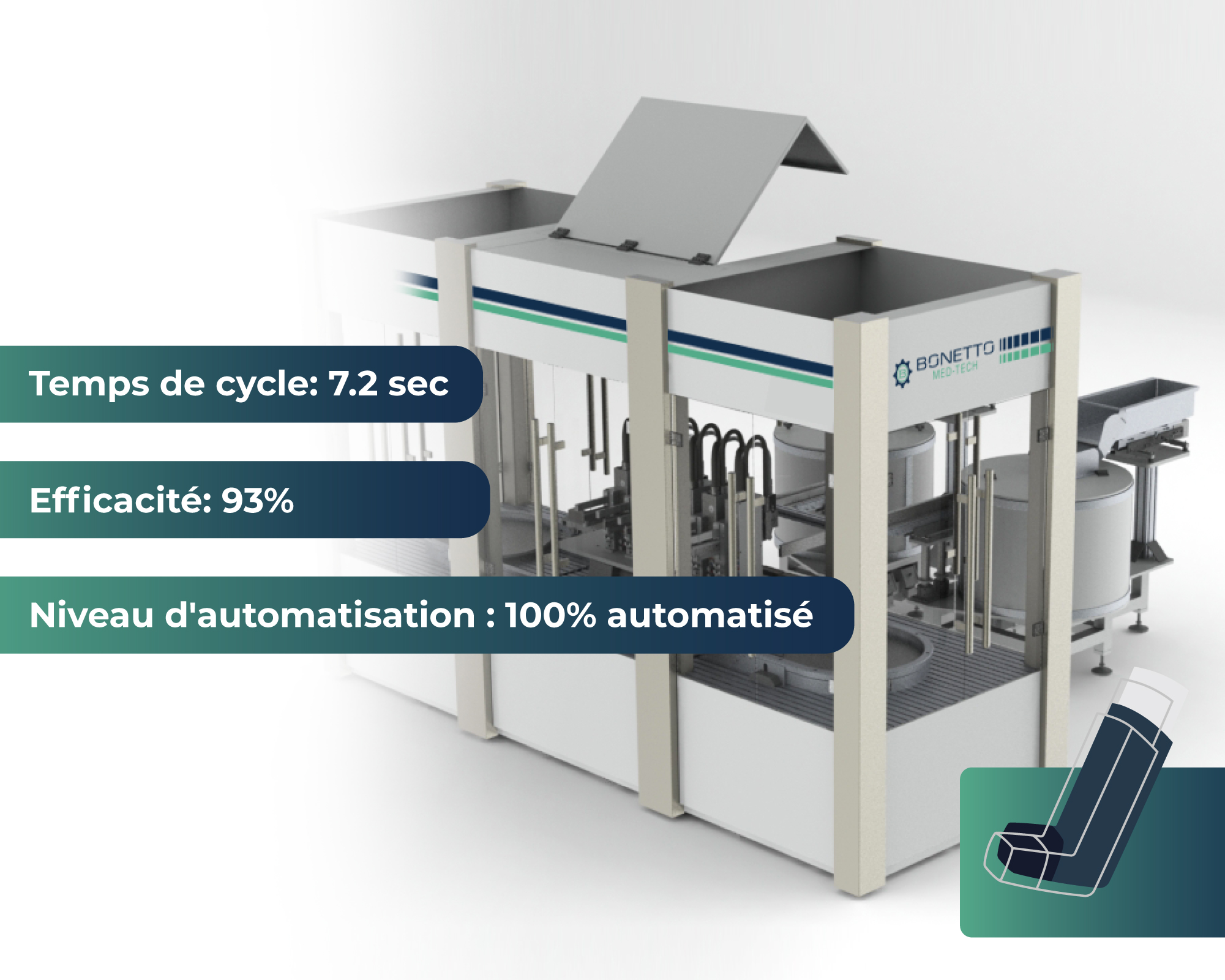 Bonetto Med-Tech a développé une ligne de production automatisée pour inhalateurs médicaux, conçue pour garantir des standards di qualité élevés, une continuité de production et une fiabilité de processus.